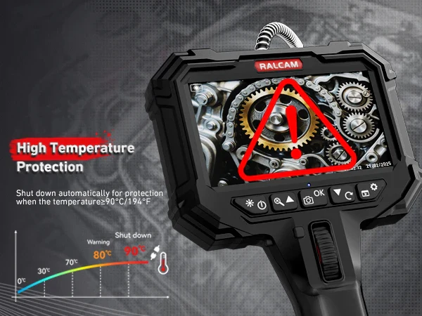 The RALCAM Endoscope automatically shuts down when temperatures exceed 90°C (194°F), ensuring safety during high-temperature inspections.