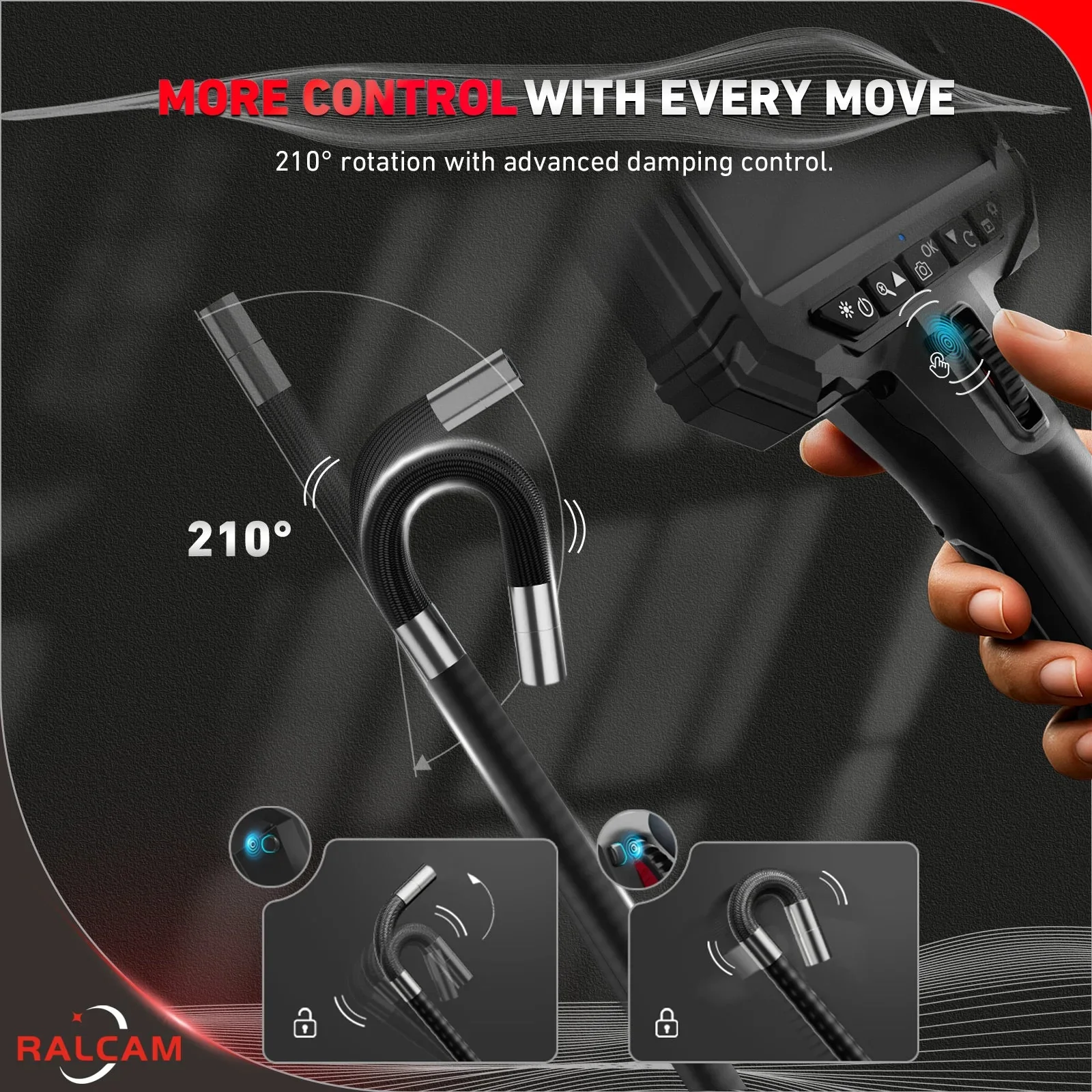 The RALCAM Endoscope comes with a detection angle locking feature, allowing you to fix the probe angle in place for steady, hands-free inspections. This ensures greater accuracy and stability when inspecting hard-to-reach areas, making it an essential tool for precise and reliable industrial and automotive inspections.