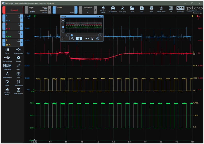 The PicoScope has enormous storage capability and can also be used to look at things that happen very slowly. Find that elusive, intermittent fault by looking back through the PicoScope's waveform buffer or by creating a long capture, which you can zoom into, of over 13 hours with 5,000 samples per second over that period.