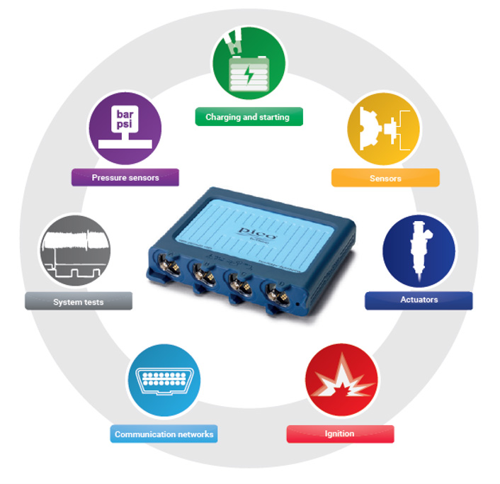 PicoScope is a powerful automotive diagnostic system based on an oscilloscope that gives you detailed insights into your vehicle’s electrical; electronic; mechanical; pressure-related; and noise, vibration, and harshness (NVH) systems. It is supplied as a stand-alone instrument with a USB cable, or in a number of kits equipped with many accessories that you use to connect to and test the systems of your vehicle.